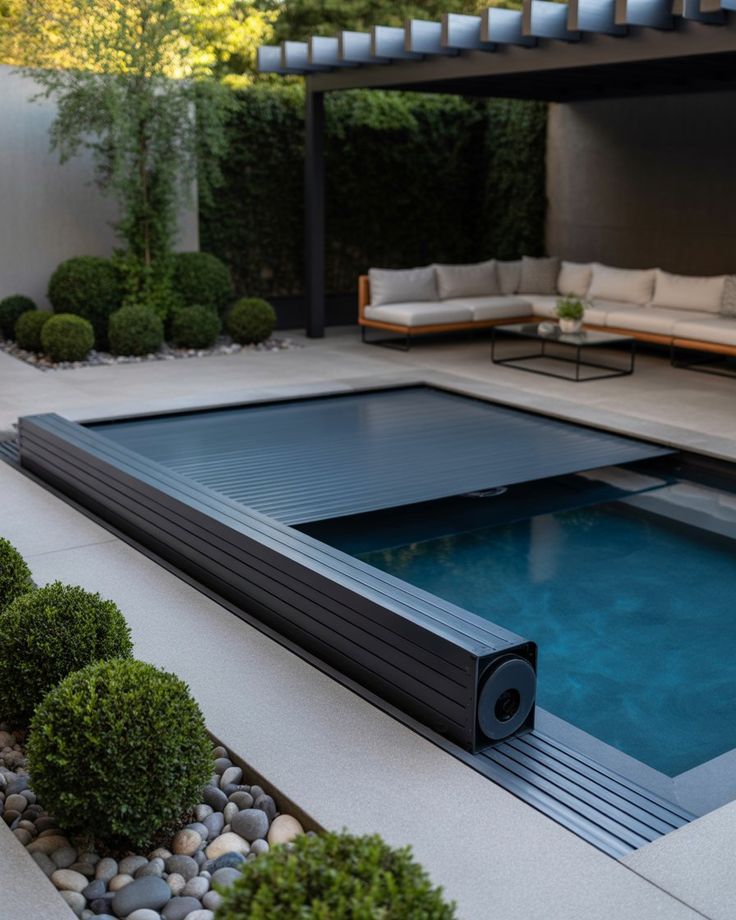 It is possible to add such traditional elements as Roman-like columns or terracotta pots to improve the beauty even more. Covering your pool with green plants will create a perfect transition between the nature and architecture.